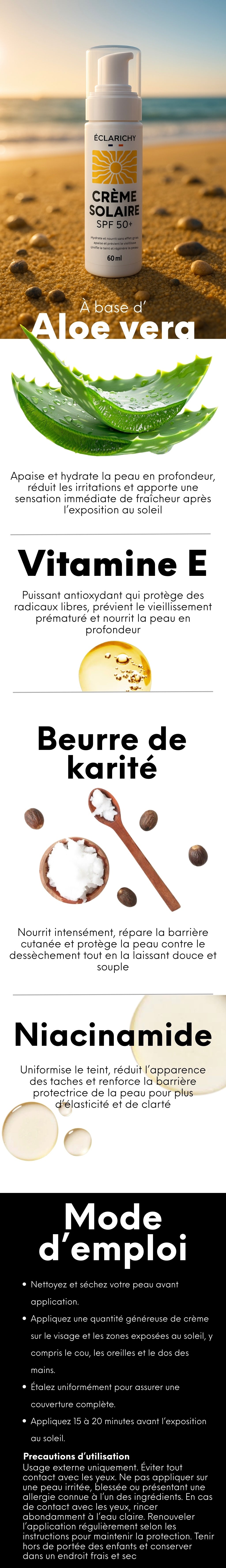 Crème solaire naturelle qui protège efficacement contre les rayons UVA/UVB, hydrate et apaise la peau tout en laissant un fini doux et non gras