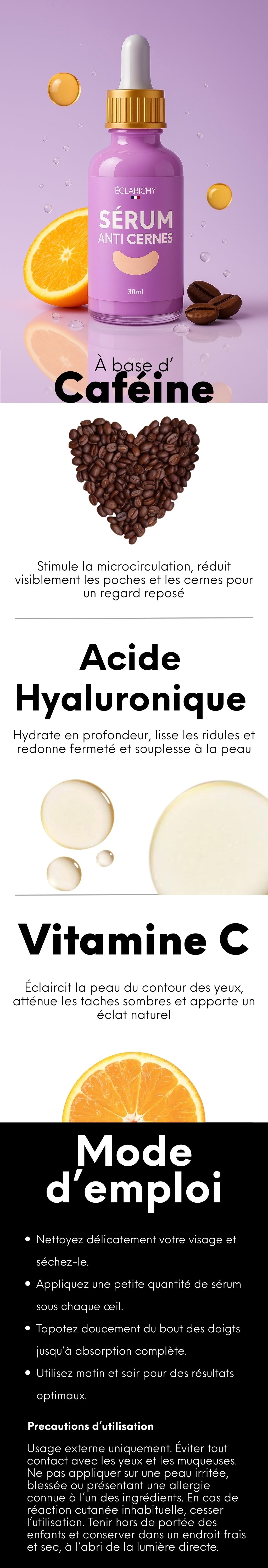 Ce sérum est destiné uniquement à un usage externe. Évitez tout contact direct avec les yeux et les muqueuses ; en cas de contact accidentel, rincez abondamment à l’eau claire. Ne pas appliquer sur une peau irritée, blessée, enflammée ou présentant une allergie connue à l’un des ingrédients. Si une réaction cutanée inhabituelle apparaît, telle que rougeurs, démangeaisons ou irritation, cessez immédiatement l’utilisation et consultez un professionnel de santé. Pour garantir des résultats optimaux, utilisez le produit conformément aux instructions et respectez la régularité d’application matin et soir. Conservez le sérum dans un endroit frais et sec, à l’abri de la lumière directe et hors de portée des enfants. Il est recommandé d’intégrer ce sérum dans une routine de soins adaptée, incluant hydratation et protection solaire si nécessaire.
